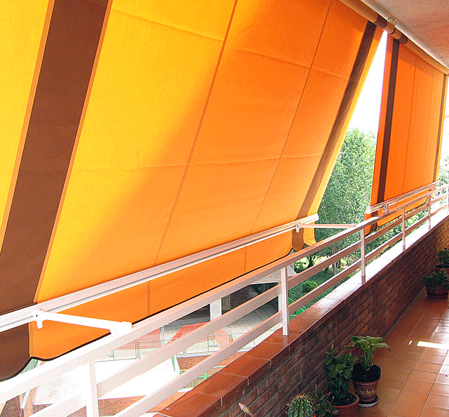 Toldo vertical para balcón. La particularidad de este modelo está en el hecho de que los brazos se encuentra colocados en el perfil de carga del mismo y según la necesidad se pueden desplegar .